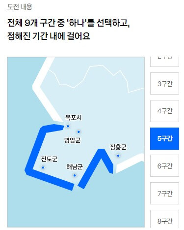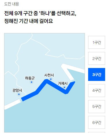 ○ 전체 9개 구간 중 ‘하나’를 선택하고, 정해진 기간 내에 걸어 종주하시면 됩니다.