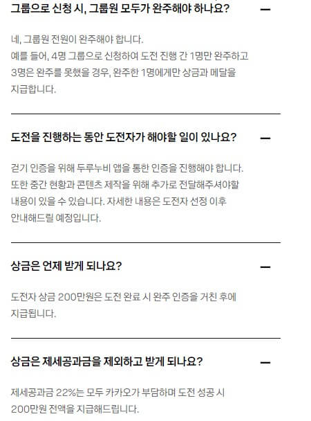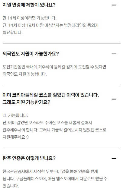 ○ 코리아둘레길 9개 구간 중 1개 도보 완주 (약 480Km 내외) 걷기 기간 중 주 1건 이상의 도보 인증숏 제출 및