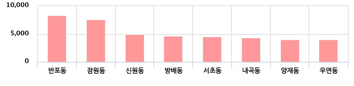반포센트럴자이, 아크로리버뷰 신반포 등 비교적 최근에 지어진 아파트들도 높은 가격대를 형성하고 있어, 신축 아파트에 대한 수요가 높음을 알 수 있습니다.
